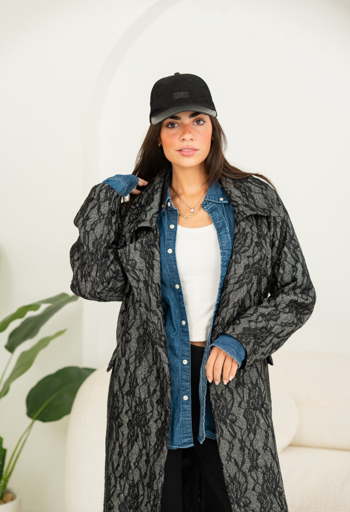 The Lacera Coat embodies quiet sophistication — a refined balance between structure and softness. Designed with intricate lace-inspired texture, it drapes gracefully while maintaining a modern, confident silhouette.