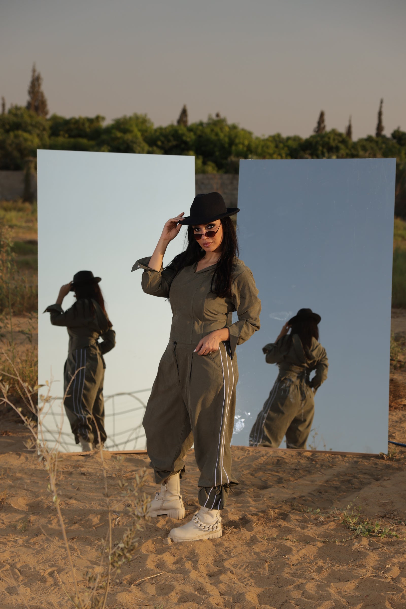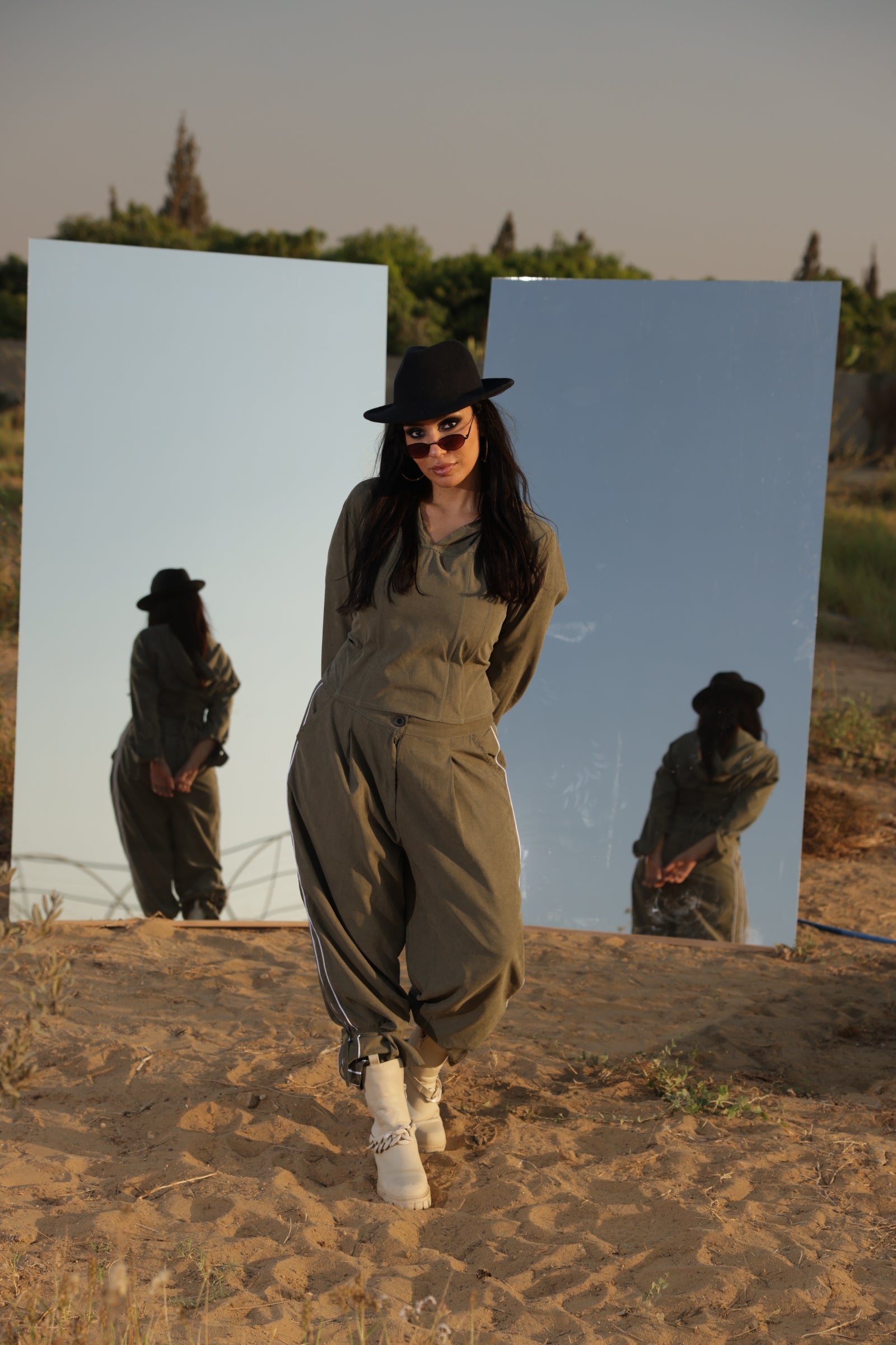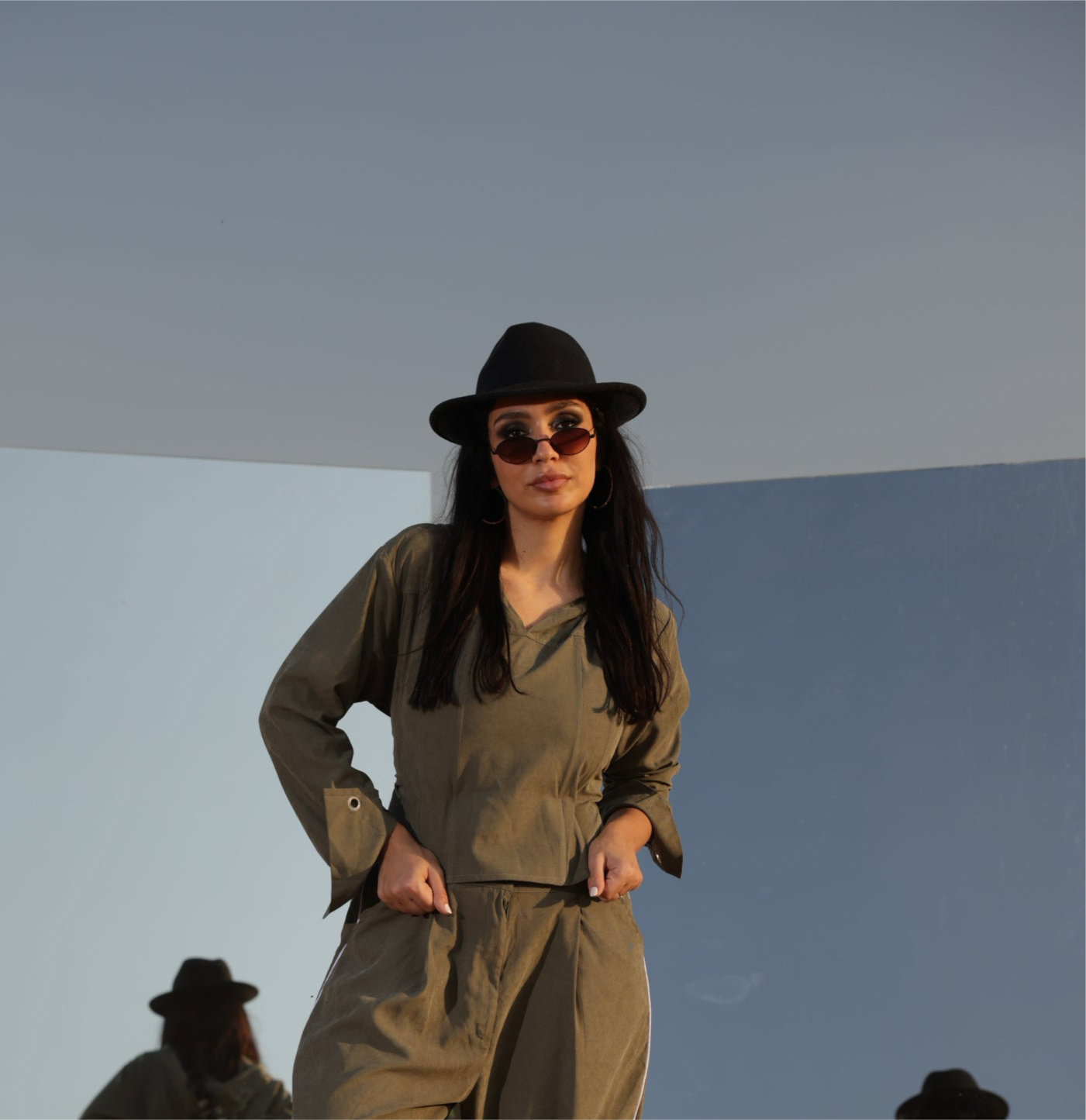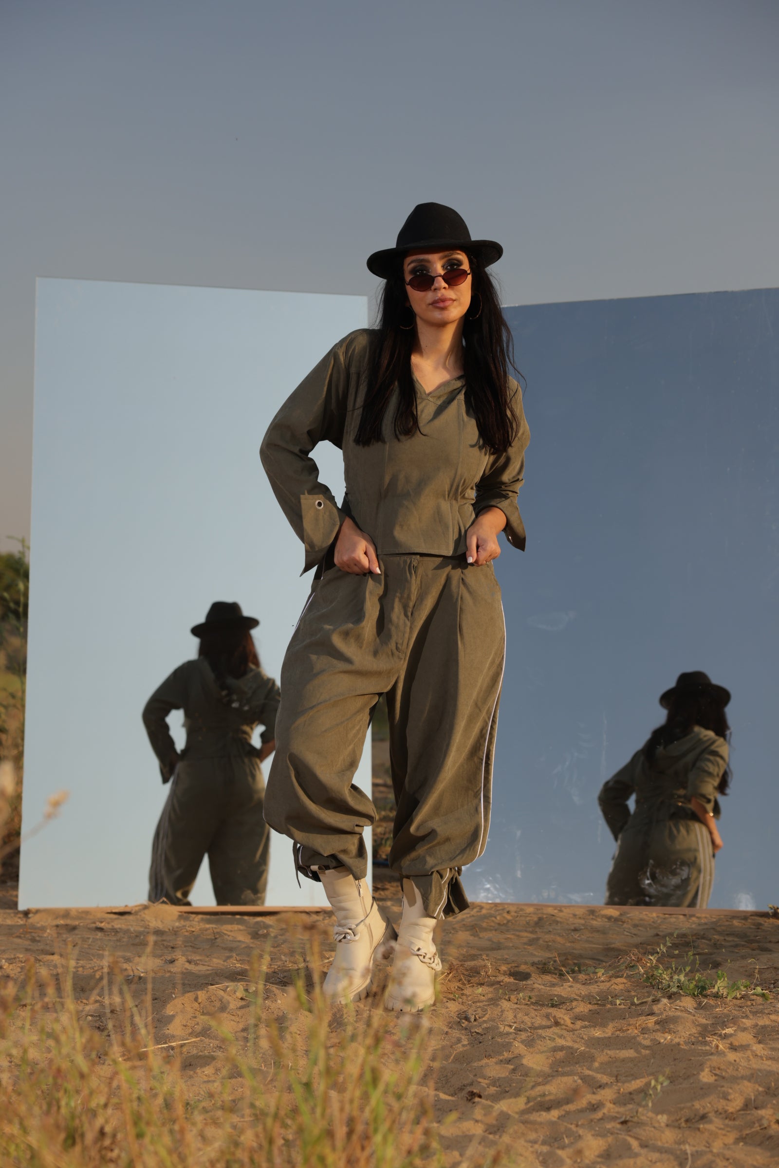 “An olive corset with poncho overlay, blending structure and flow. Statement-making on its own, or styled with the Command Pants for a complete power look.”