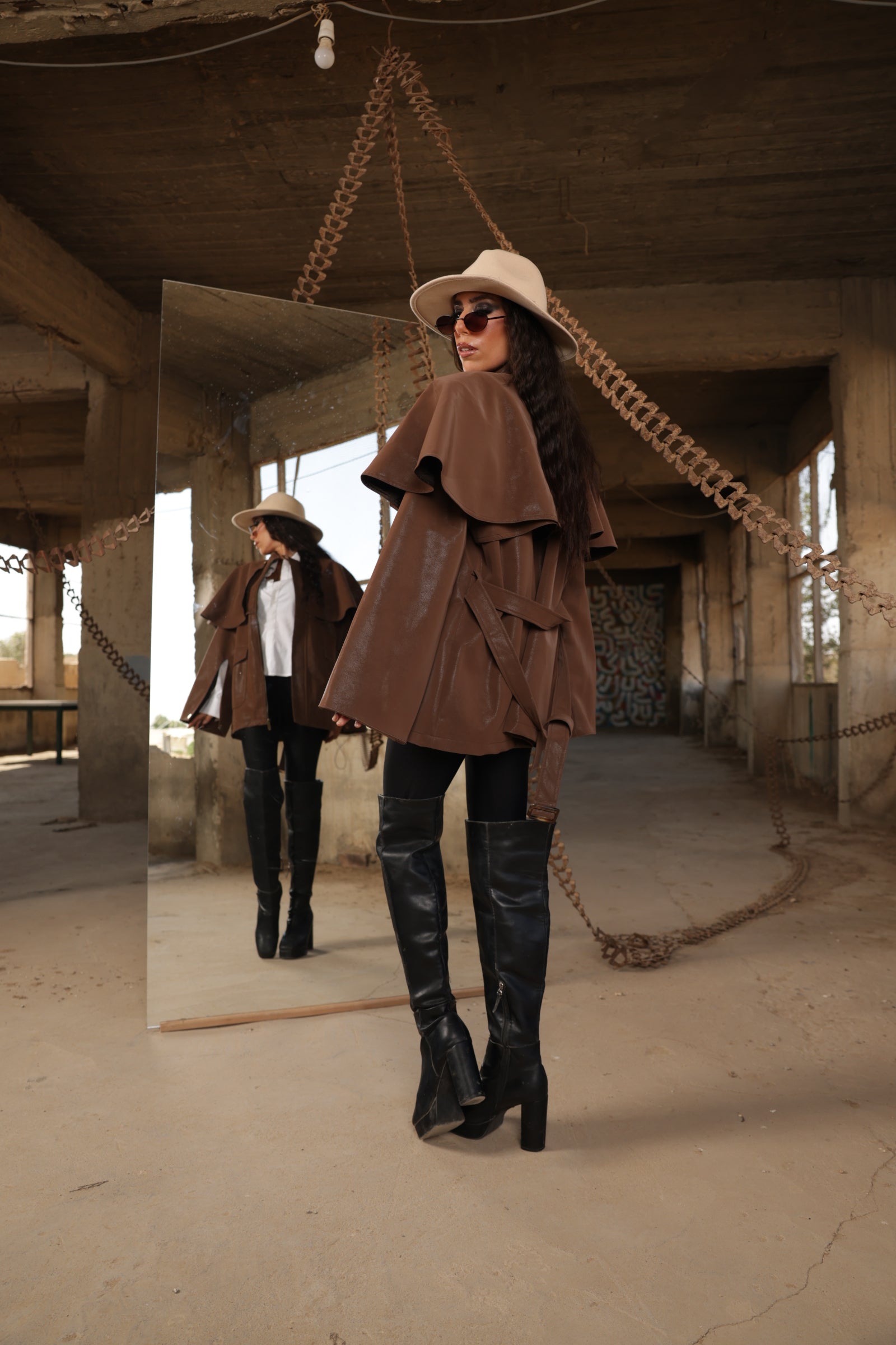 A brown leather jacket with a detachable cape and open cuff detail. Wear it draped for evening sophistication or styled casually for everyday boldness.