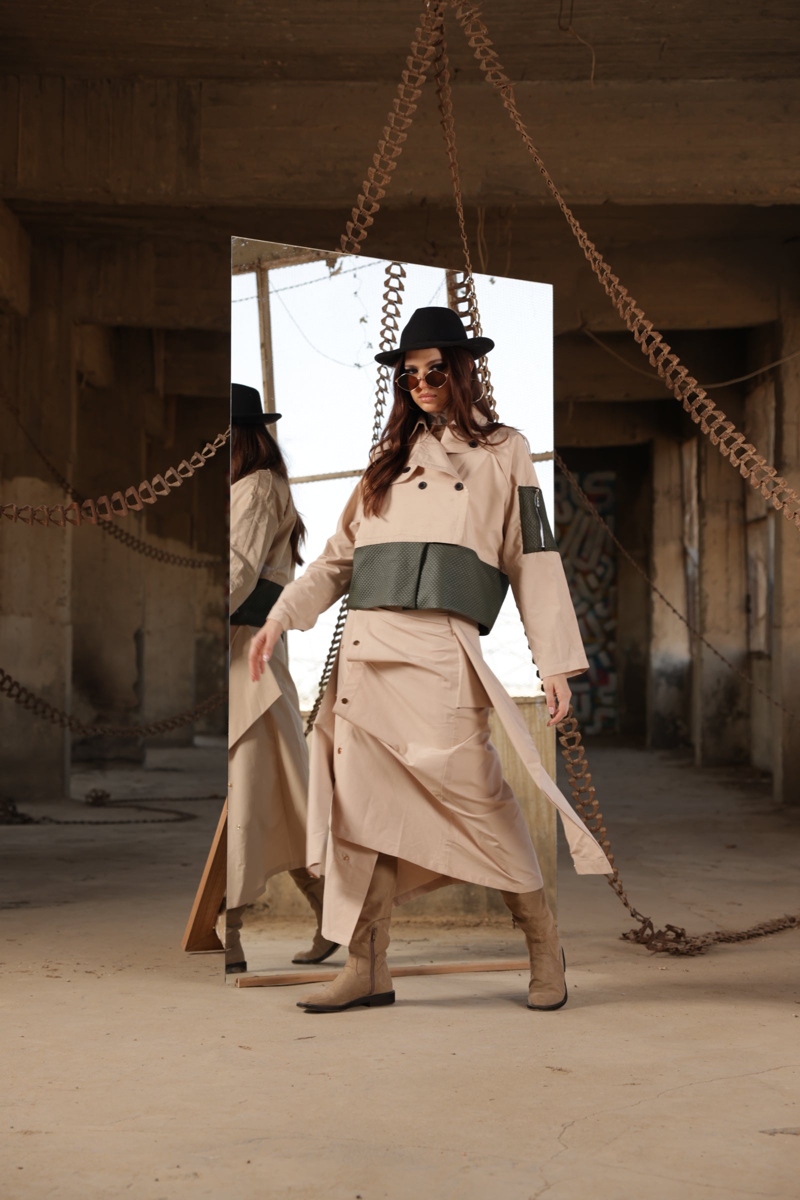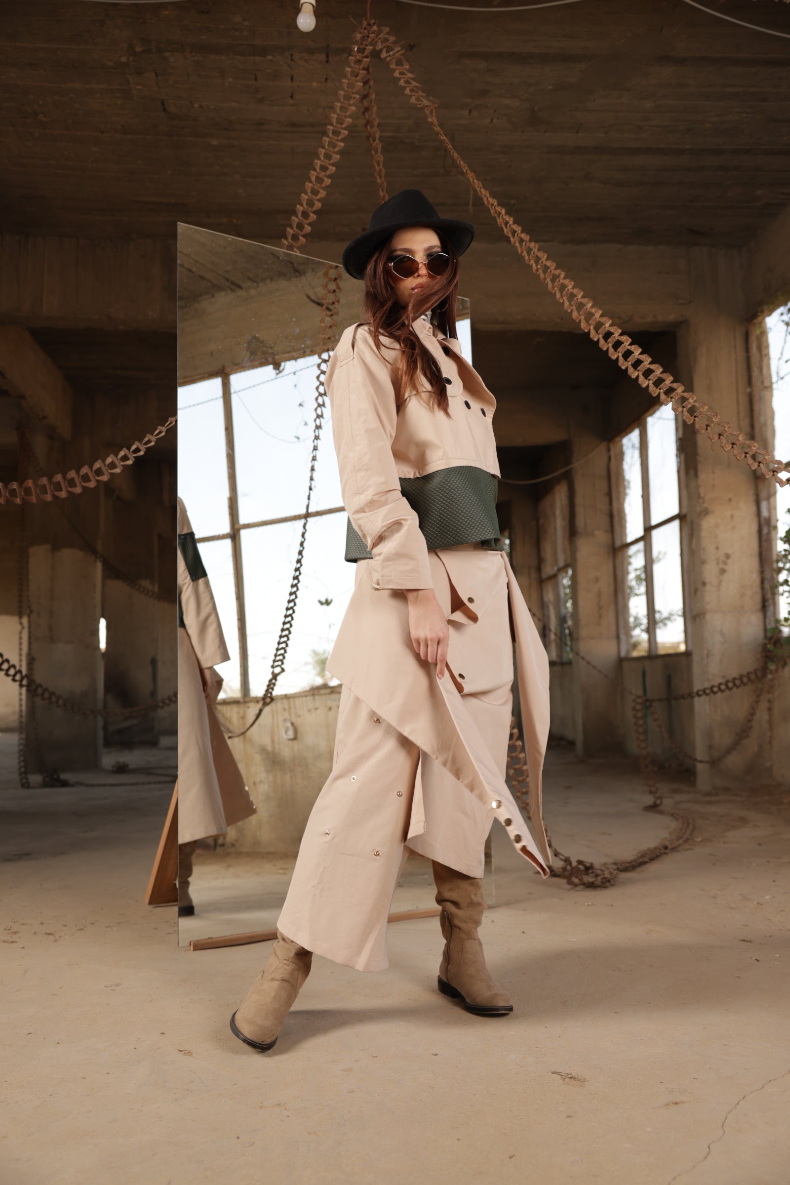 A beige maxi skirt with button details that transform its silhouette from straight to asymmetric. A statement piece for effortless day-to-night styling.