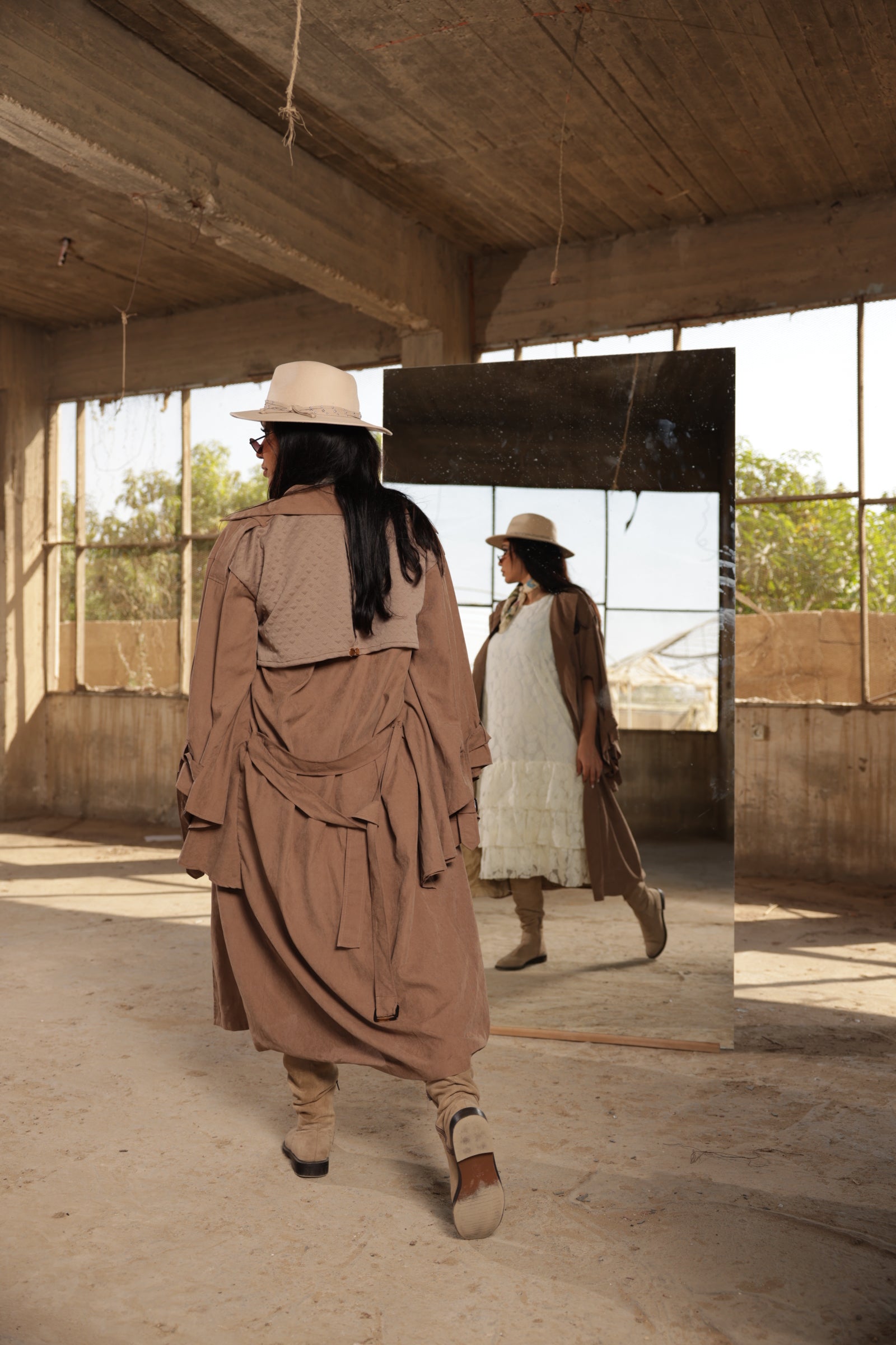 A mocha-toned coat with dramatic butterfly sleeves and dual openings for versatile styling. Step into any space and own it—the Echo Jacket was made to draw eyes, spark whispers, and leave an impression that lingers.